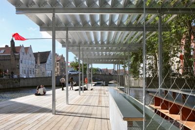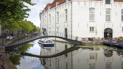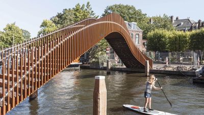 Tekst: La relation avec l'environnement est modeste mais assurée. Le pont relie deux paysages urbains très différents de part et d'autre du canal Vaart à Amsterdam : la zone urbaine surélevée d'Overamstel et le quartier verdoyant et bas d'Amsteldorp. La rive d'Overamstel au nord du pont est constituée de pierres brutes, alors qu'un quai sera aménagé au sud. Le pont se trouve exactement à la jonction entre ces deux types de rives. Notre conception tire au maximum parti de l'asymétrie et de la simplicité. L'apparence du pont est logique, évidente et modeste. Une ligne simple mais puissante naît du parc d'Overamstel, forme une charnière robuste du côté d'Overamstel et s'affine pour devenir un appui extrêmement léger du côté de Weesper. Les approches et les travées se fondent en une seule forme. La structure visible est réalisée en acier auto-patinable, en harmonie avec l'environnement rude. La quasi-totalité de la surface est constituée de tôles d'acier pliées et plates, sans soudures visibles. Ceci contribue fortement à l'impression que le pont forme une seule et même structure. Le pont et le débarcadère constituent un ensemble grâce au parapet continu. Le parapet solide s'inscrit parfaitement dans le thème des zones et des bâtiments fortifiés de la région d'Overamstel. La hauteur de passage des ponts mobiles est généralement illimitée. À cet endroit, une hauteur de passage de 5,5 m suffit. En déplaçant la rotule vers la rive, la hauteur de passage est déjà atteinte avec une ouverture de 18 degrés. Les barrières et les feux de signalisation routière forment ensemble un seul 'meuble'. Les dispositifs de freinage, les piliers et les feux de navigation sont de forme discrète et placés près de l'eau dans une seule couleur. La forme incurvée de la main courante permet à l'éclairage LED de rayonner vers le pont. Les chauves-souris volantes sous le pont ne sont pas gênées par la lumière. La rampe est séparée par galvanisation de la structure principale en acier auto-patinable. Cela permet d'éviter la formation de rouille sur la rampe. La technologie du pont est élégamment dissimulée et protégée contre le vandalisme : le contrepoids, les moteurs et les armoires électriques sont regroupés dans un espace souterrain. Le temps, le vent et les vandales n'y ont pas accès.