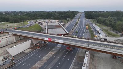 Tekst: La nouvelle passerelle du rond-point du Gros-Tilleul prend forme dans le cadre du réaménagement de l’A12. Elle a été installée mi-août 2025. Il a fallu trois grues mobiles, dont deux avec une capacité de levage de 700 tonnes, les plus grandes grues mobiles disponibles en Belgique.