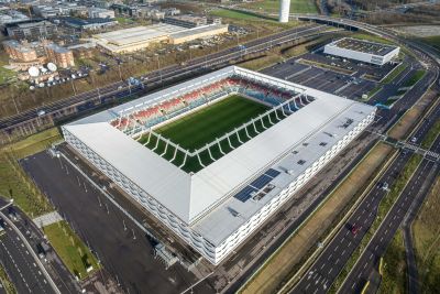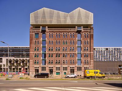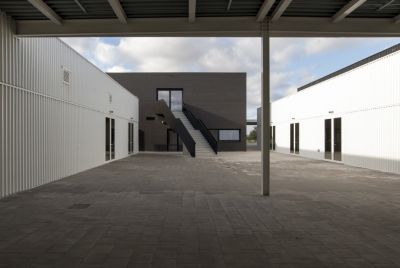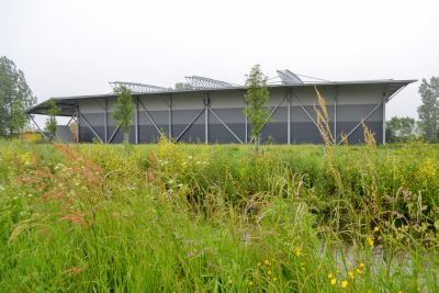Tekst: Pour la réinstallation de la société de réseau Liander, les matières premières et les matériaux ont fait l’objet d’une application circulaire maximale. Tout ce qui était encore utilisable dans l’ancienne construction a aussi été réutilisé. Une charpente de protection ondulée en acier enjambe les cinq bâtiments existants. Les toitures existantes sont des constructions en acier très légèrement dimensionnées, avec une surcapacité très réduite. C’est pourquoi la façade est suspendue à la nouvelle toiture.