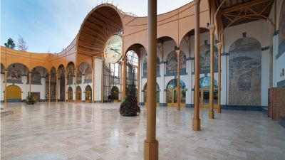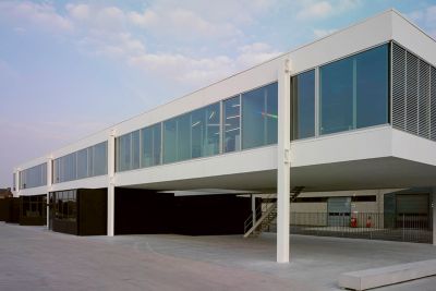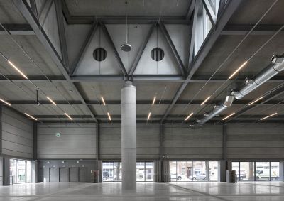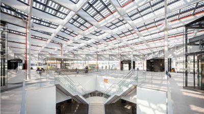 <p>Le hall d'exposition de 4480 m2 repose sur un piédestal en verre, attirant la place extérieure à l'intérieur comme une place couverte. Il s'agit d'un espace élevé dont les dimensions des baies sont de 15/30/15 m et qui repose à l'intérieur sur seulement six colonnes circulaires en béton de 1,20 m d'épaisseur. Six fermes secondaires et deux fermes primaires en acier transfèrent les charges des fermes secondaires aux six colonnes via une imposition architecturale articulée. L'entrée de la salle de conférence est dominée par un impressionnant porte-à-faux de 60x6 m qui assure une transition progressive entre le parvis et l'entrée.</p>