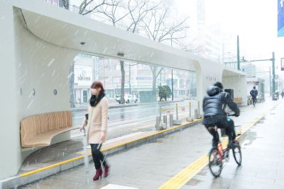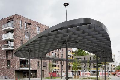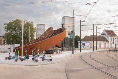 Tekst: Chacun des trois auvents de tram est constitué de composants sandwich de 6 mm d’épaisseur en acier S400. Leur profondeur varie de 250 mm à 300 mm pour les deux murs et la toiture, avec des renforts transversaux internes. Ces éléments sandwich ont été fabriqués à partir de tôles d’acier et forment des gaines fermées au moyen de soudures en bouchon, ce qui fait que les murs et la toiture se comportent comme une structure rigide continue. Pour ces panneaux, il a été tenu compte des critères sismiques japonais.