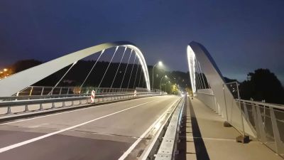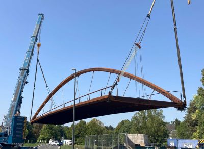 Tekst: Les 2 anciens ouvrages, franchissant la Vesdre à Nasproué et La Raye à Verviers, fortement sinistré par les inondations de 2021, sont remplacés par des nouveaux ouvrages composés de 2 poutres en caisson trapézoïdal à hauteur variable. Le tablier central est une dalle en béton coulée sur prédalles d’une largeur utile de 4 m. Ces 2 ouvrages ont été réalisés dans un marché unique de par leur analogie de conception et de dimensions. Les quartiers desservis par ces ouvrages fortement enclavés nécessitaient un timing de chantier avec coupure du passage limité. La conception de ces ponts entièrement préfabriqués a permis de limiter la période de coupure entre la pose de l’ouvrage et la mise en service à moins d’un mois et demi. La structure en acier possède une portée principale de 21 m et 26 m respectivement, sans pile intermédiaire augmentant ainsi la section hydraulique de la rivière en cas de future crue, pour un poids de 32 et 40 tonnes environ. De plus, tous les impétrants ont été intégré dans le tablier et les caissons structurels d’un part pour une meilleure intégration esthétique de l’ouvrage et d’autre part pour protéger ces réseaux en cas de future crue.