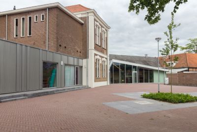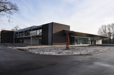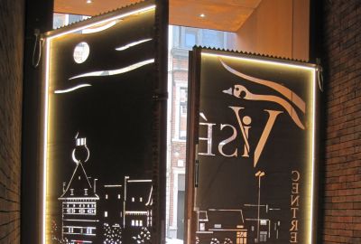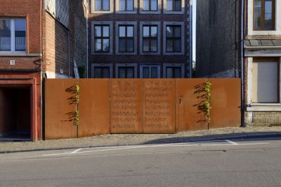 Tekst: Un porche en acier auto-patinable ('corten') est destiné à matérialiser l’accès du centre culturel de Visé. L’entrée est marquée par un portique monumental aux arrêtes effilées qui se prolonge vers le couloir par un habillage latéral et supérieur en tôlés pliées. L’ensemble des éléments sont fixés de manière invisible. Les parois sont légèrement évasées vers l’extérieur pour accentuer l’effet d’entonnoir. Un écran vient s’intégrer dans le calepinage pour l’annonce des événements culturels. L’entrée intérieure est sécurisée par un double portail en tôle pliée. Un motif emblématique de l’histoire de la ville est découpé dans la tôle. Ce volume apporte une tonalité contemporaine à l’édifice.