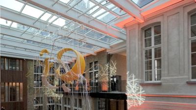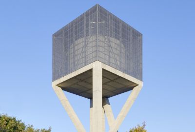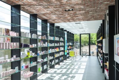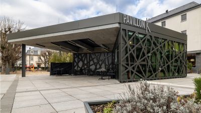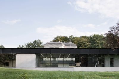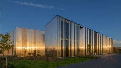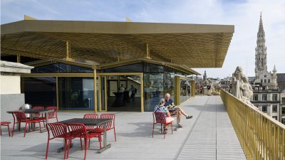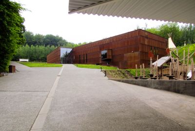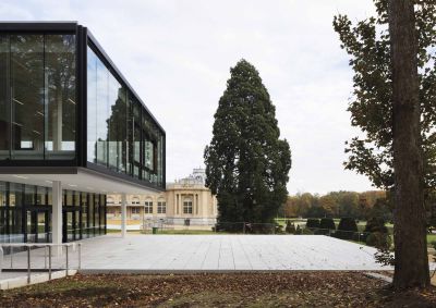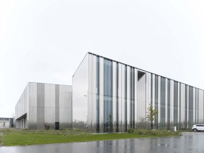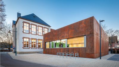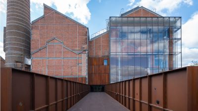 Tekst: Le bâtiment classé de la Machine-à-eau est conservé au sein d’un complexe ambitieux autour duquel deux extensions contemporaines complètent le bâtiment historique, l’englobant dans un ensemble porteur de sens de sa nouvelle fonction. L’acier se retrouve dans la passerelle de 16 m de long, une tôle pliée de 10 mm dans l’esprit des origamis, qui caractérise de nombreux éléments de la ferronnerie mais qui imprègne aussi les nouvelles façades qui donnent volontiers l’impression d’une surface pliée plutôt que d’une masse. Le mobilier aussi recourt abondamment à l’acier.