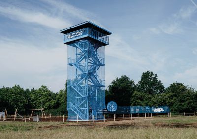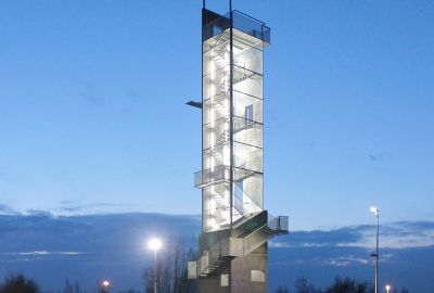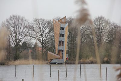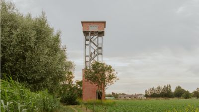 Tekst: Cette tour d’observation offre une vue sur De Wijers à Zonhoven. La structure de base centrale est constituée de trois colonnes rondes en acier galvanisé auxquelles les escaliers et les plans de façade sont suspendus. Ceci donne des cadres en acier qui sont remplis de bois de chêne, tant pour les surfaces de façade habillées que pour les sols praticables en bois. Les marches d’escalier ont été exécutées en acier galvanisé perforé.