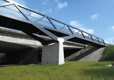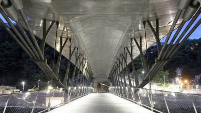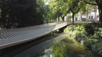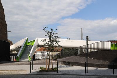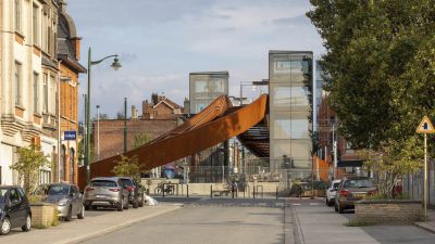 Tekst: D’une portée de 22 m pour 4 m de large, cette passerelle à Verviers s’articule autour d’un profilé reconstitué soudé (PRS) à hauteur variable qui délimite deux cheminements, un cheminement direct et une promenade en arc. Le support du platelage s’étend quant à lui en porte-à-faux de part et d’autre sur cette poutre considérée comme la colonne vertébrale de la passerelle. La torsion engendrée par des chargements dissymétriques est reprise par un arc déconstruit formé des tubes latéraux : l’un rectiligne assure le rôle de tirant et l’autre selon la forme de l’arc.