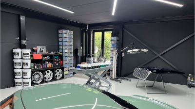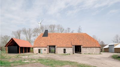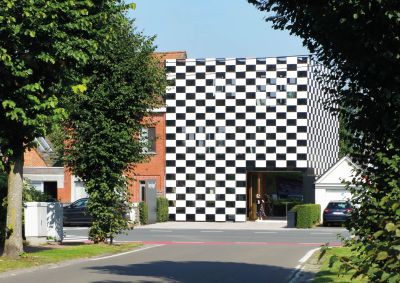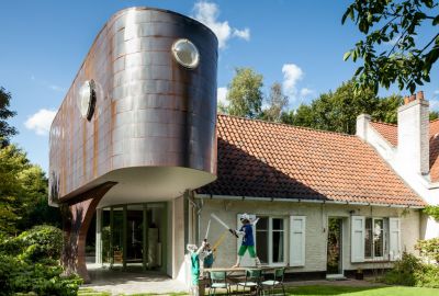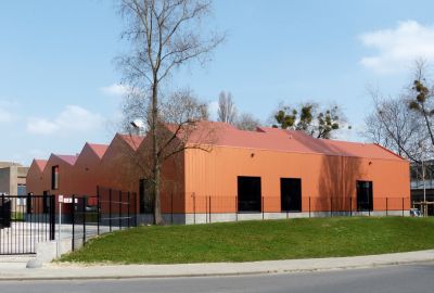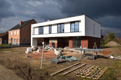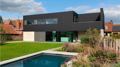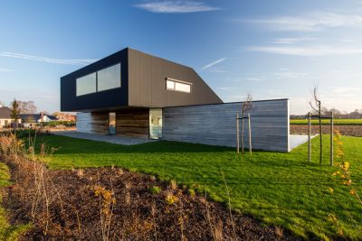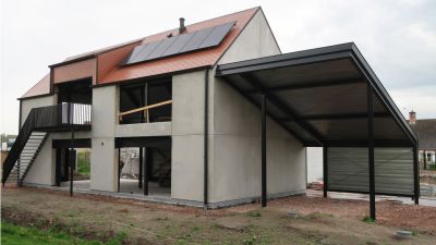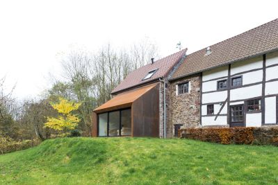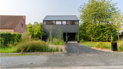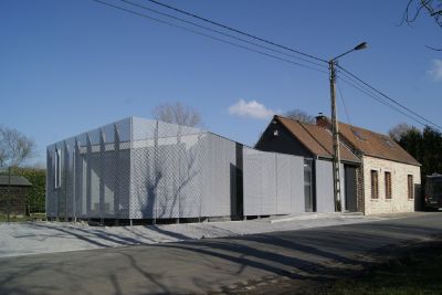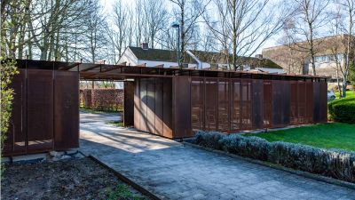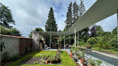 Tekst: L’auvent en acier qui contraste avec l’habitation de mineur à Houthalen confirme le caractère solitaire de la maison isolée et se réfère à l’arrière-corps flamand caractéristique. Le programme pour l’auvent est constitué d’un double garage, d’un abri à vélos, d’un abri de jardin, d’une étable, d’une entrée couverte et d’une terrasse couverte. La toiture est constituée de 26 éléments qui ont été préfabriqués en atelier. Les ailettes de support (épaisseur de 4 mm) et les nervures latérales (épaisseur de 6 ou de 10 mm) ont été soudées sur la plaque de toiture (épaisseur de 3 mm).