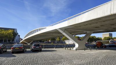 Tekst: La culée de cet ouvrage mixte acier-béton s’appuie sur un tunnel routier permettant de garantir l’accès des véhicules vers la nouvelle berge aval à créer, combinée avec une pile circulaire implantée en vieille Meuse. Les conséquences de ce choix furent très positives, apportant une légèreté remarquable à l’ouvrage ainsi qu’une très belle cohérence de l’ensemble des ouvrages de cette zone compliquée.