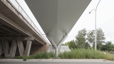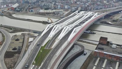 Tekst: Le pont sur l'avenue Léopold III (A201) auprès de Bruxelles est un enrichissement remarquable du paysage urbain, dont l'accessibilité, la sécurité routière, la mobilité et la qualité de vie de l'environnement sont durablement améliorées. Avec une longueur totale de 710 m - une structure en acier de 510 m et deux rampes d'accès de 100 m - ce pont est à l'heure actuelle le plus long pont pour cyclistes et piétons de Flandre. Afin d'intégrer un pont d'une telle longueur dans l'environnement bâti, son apparence a été conçue pour être aussi légère et transparente que possible et le tout a été réalisé de manière semi-intégrale. Le tablier et les balustrades ont été réalisés en acier revêtu de blanc et le pont repose sur des colonnes en acier gris en forme de V aux angles coupés. Avec sa pente progressive en une seule courbe, son tracé rectiligne et la répartition régulière des travées, le pont s'intègre harmonieusement dans son environnement. Il constitue, dans le cadre du projet 'Werken aan de Ring' (Travaux sur le Ring) de la Werkvennootschap, un maillon essentiel du réseau cyclable de la périphérie flamande.
