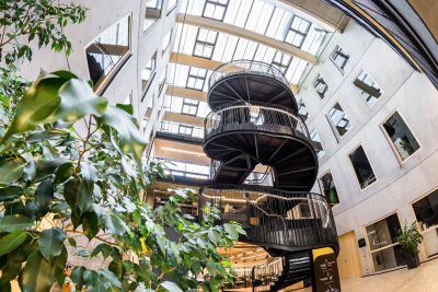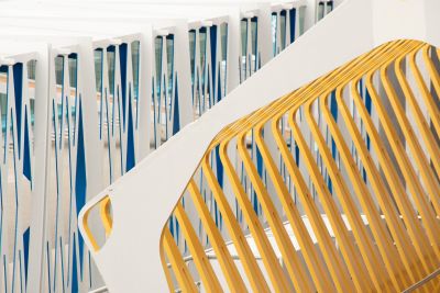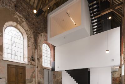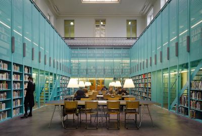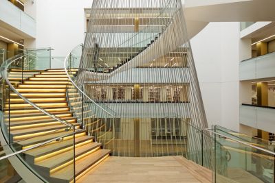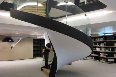 Tekst: Datant de la fin du XIXe siècle, le bâtiment abritant la bibliothèque a subi plusieurs transformations au cours du temps. Les modifications apportées dans les années 50, doublant notamment les capacités de rangement pour une même superficie, ont entraîné un risque d’effondrement en cas d’incendie. C’est dans ce contexte qu’il a été décidé d’effectuer une rénovation de fond en comble. Un escalier monumental dessert 4 étages et prend place au centre du bâtiment. Il s’appuie sur les différents paliers et est suspendu grâce à des câbles inox à la coupole.