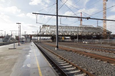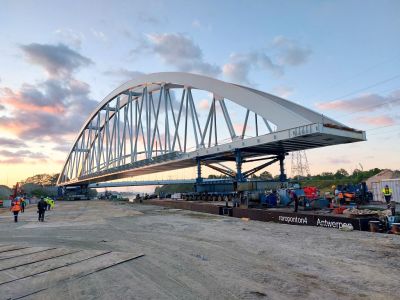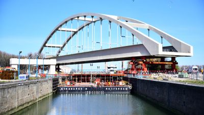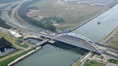 Tekst: Pour répondre à l'augmentation du trafic de conteneurs sur le canal Albert, le pont ferroviaire au-dessus du canal à Herentals (dans le province d'Anvers) a été remplacé et surélevé, rejoignant ainsi les ponts ferroviaires de Kuringen et Genk. Le nouveau pont en acier, d'une longueur de 164 m, est le plus long pont ferroviaire isostatique à double voie de Belgique. Il offre une hauteur de passage libre de 9,1 m. La conception du pont à fixation directe des rails a été fortement influencée par les exigences strictes imposées en matière de déformation pour le trafic ferroviaire sous l'influence combinée des charges mobiles horizontales et verticales, du vent et de la température, et a nécessité l'analyse de millions de combinaisons de charges. Il en a résulté une conception spécifique dans laquelle les arcs s'inclinent l'un vers l'autre, avec trois points d'appui sur chaque culée pour une répartition optimale des forces. Le pont de 3000 tonnes d'acier a été en partie construit dans l'atelier d'Aelterman avec des tôles d'acier allant jusqu'à 100 mm d'épaisseur, imposant des exigences élevées en matière de techniques d'assemblage et de soudage. Sur place, le pont a été assemblé sur les berges, notamment à l'aide de travaux de soudure à 30 m de hauteur, puis placé à son emplacement définitif à l'aide d'un ponton et des TMA (Transporteurs modulaires autopropulsés), à côté de l'ancien pont qui devait rester en service jusqu'à la mise en service du nouveau pont.