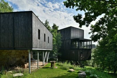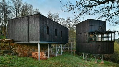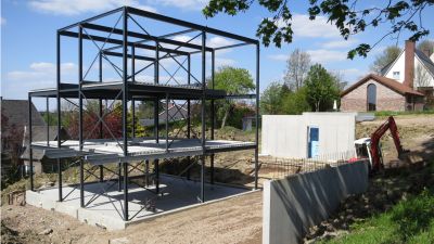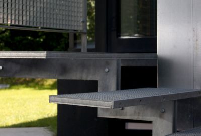 Tekst: L’extension prolonge l’organisation existante d’une habitation des années 80 en proposant une cellule parentale en sous-sol et un espace de travail avec salon à l’étage. Employé pour les principaux éléments structurels hors sol, l’acier marque également les différents accès. Les éléments extérieurs sont galvanisés à chaud. A l’intérieur, l’acier est conservé dans son jus, simplement protégé d’un vernis mat.