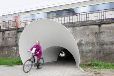 Tekst: La passerelle blanche pour vélos au-dessus du Westerring de Genk se remarque surtout par son aspect tourbillonnant. Deux éléments tubulaires élancés serpentent au-dessus de la route, tout comme pour un rollercoaster. La forme du pont a été adaptée de manière minutieuse aux forces qu’il subit. Les arcs et les assemblages de charpente coopèrent et font en sorte d’utiliser optimalement (la force de) chaque kilo d’acier (S355 J2). Le résultat de cet exercice est une construction affinée et fluctuante.