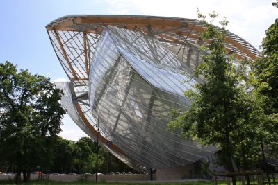 Tekst: L’édifice conçu par l’architecte Frank Gehry se présente extérieurement comme un nuage de verre posé sur un plan d’eau. La façade du bâtiment est faite de grandes surfaces en panneaux aux géométries complexes et d’enveloppes vitrées. L’ensemble forme le clos et couvert du bâtiment, tandis qu’une deuxième peau, constituée de 12 voiles de verre toutes différentes, l’enveloppe de manière fluide sans créer de nouveaux espaces fermés. Ces verrières comprennent des assemblages mixtes bois-acier très complexes et des charpentes métalliques.