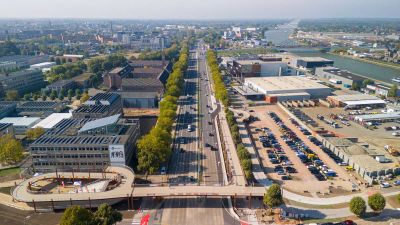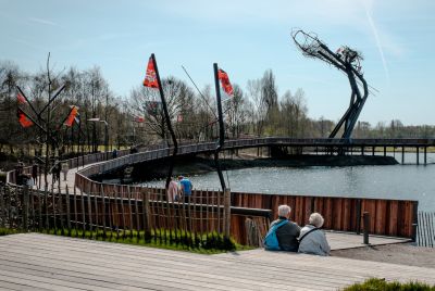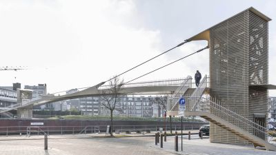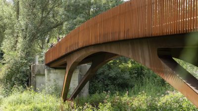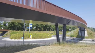 Tekst: Le pont cyclable de Helchteren au Limbourg belge, ouvert en 2023, constitue une liaison sûre et durable entre le quartier Kievitwijk et la zone PME, au-dessus de la N715. Intégré à la véloroute F74, il offre un passage confortable aux cyclistes et aux piétons. La conception du pont est aussi fonctionnelle qu'intégrée dans le paysage. Sur le côté ouest, une rampe légèrement inclinée guide les cyclistes et les piétons entre les cimes des chênes pédonculés matures. Cette intégration naturelle offre une expérience agréable de la végétation environnante. Au sommet du pont se trouve un espace de repos doté de sièges, où les usagers peuvent faire une pause et profiter de la vue sur la réserve naturelle de Molenheide. À l'est, le pont est relié à une structure métallique robuste qui s'intègre visuellement dans le contexte industriel de la zone PME. Ce virage offre également un endroit pour s'arrêter un instant et admirer le paysage. Le pont a été conçu dans un souci de multimodalité. Il est relié à des arrêts de bus rénovés, à des passages piétons sécurisés et à un réseau de pistes cyclables et de sentiers pédestres réaménagé. Il en résulte un nœud où se rejoignent différents modes de transport, contribuant ainsi à la transition vers des déplacements durables. Le pont est en outre entièrement accessible aux personnes à mobilité réduite, grâce à sa pente progressive et à ses chemins larges et dégagés.