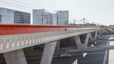 Tekst: L’ouvrage OA894 constitue un pont de franchissement majeur au-dessus de l’autoroute A1 dans le cadre du prolongement de la ligne n°1 du tramway luxembourgeois vers l’aéroport du Findel. Il s’agit d’un ouvrage mixte acier-béton, composé de deux travées hyperstatiques de 45 m et 63 m, pour une portée totale de 108 m. L’implantation répond à des exigences fortes en matière de fonctionnalité ferroviaire, de contraintes autoroutières et d’intégration dans l’environnement. Le tablier supporte deux voies de tramway ainsi que deux pistes de service, présentant une largeur utile totale de 7,27 m. L’ouvrage OA894 incarne un exemple remarquable de synergie entre ingénierie structurelle avancée et design architectural intégré. Sa charpente métallique fermée assure une robustesse optimale pour un franchissement ferroviaire en courbe, tandis que son habillage en aluminium confère à l’ensemble une légèreté visuelle et une signature contemporaine. Pensé pour durer, l’ouvrage s’inscrit avec élégance dans un environnement paysager délicat, à proximité immédiate d’une zone Natura 2000.