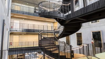 Tekst: Le projet de réhabilitation lourde (démolition, reconstruction complète tout en conservant les façades) d’un îlot situé rue Madeleine à Liège comprend la création d’un patio végétalisé couvrant un parking. Ce lieu central du projet nécessite la création de connexions verticales. Un escalier hélicoïdal en acier auto-patinable dessert 2 passerelles de connections distribuant les étages supérieurs. Structurellement, le souhait est de limiter les appuis et autres contraintes qui parasitent la lecture de l’objet. L’escalier est composé d’un unique limon central porteur (caisson constitué de tôle de 20 mm) et de marches (de 8 mm) en porte-à-faux. Les tôles constitutives du limon sont fortement gauches (non développables) nécessitant un grand savoir-faire dans la mise en force de ces tôles. Ce caisson est le seul élément structurel de l’escalier qui doit également reprendre les charges des passerelles qui s’y connectent. La disposition des passerelles permet de créer un ensemble équilibré sur 3 appuis révélant le savoir-faire historique des chaudronniers. Les passerelles sont des caissons en acier trapézoïdaux à section variable de 30 cm de hauteur. L’utilisation de l’acier permettait ici de réaliser une structure légère et élégante, facilement transportable en cœur d’ilot.