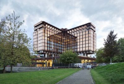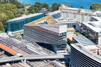 Tekst: Le nouveau siège de Japan Tobacco International (JTI), niché dans le quartier international de Genève, a été conçu en adoptant une technique utilisée pour la construction de ponts : architectes et ingénieurs ont réalisé une console (un porte-à-faux de 60 m) qui permet à la construction de ne toucher le sol qu’en deux points, et ainsi de créer dans le vide un espace public ouvert à tous.