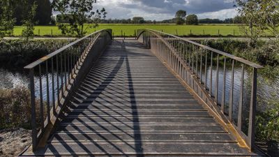 Tekst: Le pont reliant les ruines du château Ter Elst à Duffel a été officiellement inauguré en 2025 par la Fondation Kempens Landschap et la commune de Duffel. Ce nouveau pont piétonnier relie l'île du château au Muggenbergpark et au chemin de halage le long de la Nete, et fait également office de voie d'évacuation sécurisée. L'inauguration marque une étape importante dans la restauration des ruines, qui devrait être entièrement terminée à l'horizon 2026. Le site restauré sera destiné à accueillir des événements, et le nouveau pont viendra renforcer cette fonction en améliorant l'accessibilité. Le pont de 20 m de long est fabriqué en acier auto-patinable. Il a été transporté en une seule pièce et assemblé à l'aide d'une grue de montage.