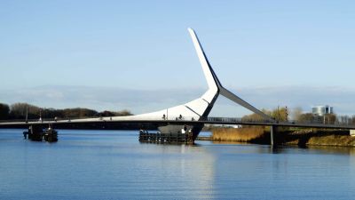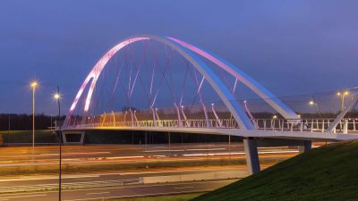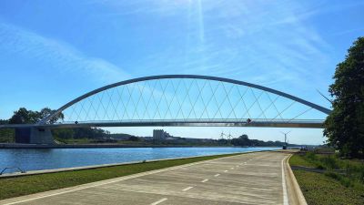 Tekst: Ce pont cyclable asymétrique avec caisson de torsion porteur et tablier en porte-à-faux attire discrètement le regard dans le paysage de polders entre Voorhout et Noordwijk auprès de Leiden (Hollande du Sud). Le pont décrit une courbe prononcée, encadrée à l'intérieur par le caisson de torsion qui s'élève au-dessus du tablier. Les points d'appui intermédiaires sont situés directement sous le caisson de torsion, à l'endroit où les efforts sont les plus importants. La conception structurelle réduit au minimum la différence de hauteur pour les cyclistes, ce qui contribue au confort d'utilisation. Les deux approches diffèrent à presque tous les égards : un remblai d'un côté et une construction dans l'eau de l'autre. C'est là que commence le pont avec une partie plate, qui offre aux cyclistes qui montent de l'espace pour prendre leur élan et à ceux qui descendent de l'espace pour surveiller la route transversale et s'arrêter si nécessaire. En raison de sa forme et de ses dimensions (73 m de long, 4 m de large), son transport a été un véritable défi. Le pont a finalement été transporté en trois parties jusqu'à son emplacement. Les différentes parties ont ensuite été assemblées à l'aide de boulons. Une attention particulière a été accordée à la conception minutieuse des trappes qui rendent les raccords accessibles tout en les dissimulant à la vue.