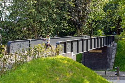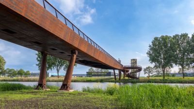 Tekst: Les ponts ferroviaires miniers conçus par ipv Delft pour Hoensbroek, en Limbourg, sont deux ponts cyclables robustes en acier qui regorgent de références à la riche histoire minière du site. Le design rappelle fortement les ponts ferroviaires en acier d'antan, avec des balustrades porteuses en forme de poutres en acier avec des cloisons verticales. Grâce à une solution intelligente avec des butées qui empêchent le pont de se déplacer dans son ensemble en cas de collision, il a été possible de prendre en compte une charge d'impact relativement faible. Le résultat : un tablier de pont élancé. Les deux ponts sont identiques dans leur conception, mais diffèrent dans leurs dimensions (11x5 et 24x5 m). Tous deux sont situés sur la Parkstadroute, une nouvelle piste cyclable et un sentier de randonnée de 34 km de long qui relie les attractions naturelles et touristiques de la région du Limbourg. À Hoensbroek, la Parkstadroute se trouve en partie sur le talus de l'ancienne voie ferrée minière, et c'est précisément là que se trouvent ces ponts en acier.
