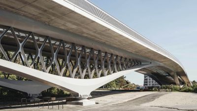 Tekst: Bourg-lès-Valence, une ville fluviale coupée du Rhône depuis la construction de l'A7 en 1965 – connue sous le nom de 'route de soleil' –, a constamment cherché à rétablir le contact avec le fleuve. La 'Passerelle Bleue', construite en 1989, n'offrait toutefois pas la liaison souhaitée à cause de sa difficile accessibilité. Le nouveau pont piétonnier vers le quartier 'l'île Girodet' a été conçu pour remédier à cela et s'inscrit dans un nouveau plan directeur. La ville a demandé un pont qui relie l'île à la ville, renforce le plan de circulation tout en tenant compte de la piste cyclable Via Rhôna, sans pour autant nuire à l'attrait et à l'expérience du parcours. Le souhait de maintenir la hauteur de la passerelle aussi basse que possible et de minimiser les pentes du côté du Quai Barjon a conduit à l'utilisation d'une structure porteuse élevée au-dessus du tablier. Même si plusieurs types de ponts peuvent convenir pour une portée d'environ 60 m, le recours à un pont à haubans ou à une structure suspendue mono-pylône permet de créer un signal visuel fort. Telle est la réponse à la demande du maître d'ouvrage. Le pont piétonnier est un pont à haubans asymétrique avec un pylône central articulé. La construction est intégrale, c'est-à-dire qu'elle est solidement reliée à la fondation. La dilatation thermique est compensée par le déplacement transversal de la construction, rendu possible par la forme prévue. Le tablier et le mât sont entièrement en acier S355, à l'exception du palier du mât, qui est en acier forgé S325G. Le tablier est constitué d'une poutre caisson rectangulaire creuse, constante sur toute la longueur de la structure, avec une plaque supérieure renforcée longitudinalement de 400 mm. La partie pylône est un tube d’acier creux de diamètre variable. Les haubans sont constitués de câbles entièrement verrouillés qui ont été protégés contre la corrosion en atelier par galvanisation, puis par un revêtement riche en zinc sur place. La passerelle piétonne devient le symbole de la reconstruction du quartier 'l'île Girodet'. Elle est également le point de repère qui invite les gens à traverser le pont.