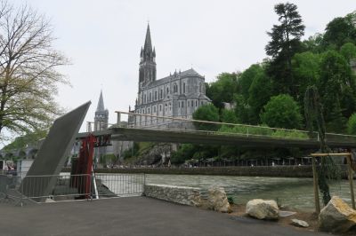 Tekst: Le site du Sanctuaire de Lourdes est un lieu chargé d’histoire, de spiritualité et de silence. En juillet 2013, une crue a provoqué d’importants dommages aux ouvrages existants. Afin de laisser passer la « colère » du Gave de Pau, une passerelle a été conçue pour se lever grâce à un système de vérins hydrauliques logés dans les culées de l’ouvrage. La structure et le platelage sont réalisés en inox duplex. La passerelle se caractérise par sa finesse (40 cm d’épaisseur pour 38 m de portée).