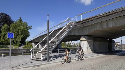 Tekst: Le pont Saspoort à Diest, inauguré en 2025, est un élégant pont cyclable et piétonnier à hauteur du site historique 'Grote Steunbeer', un barrage historique sur la Demer détournée. Il constitue une liaison sûre et confortable entre Schaffen et le centre-ville, et fait partie du réseau flamand d'autoroutes cyclables. Le pont en acier avec un tracé en forme d'arc de 100 m de long s'intègre parfaitement dans le paysage et le patrimoine et remplace un passage vieillissant. Il contribue à la mobilité durable, à la gestion des eaux et à la rénovation urbaine. Le pont est entièrement accessible, rejoint les itinéraires existants et renforce la connectivité dans la région. Le nom 'Saspoortbrug' fait référence à la porte d'accès historique située le long de l'eau et a été choisi via un sondage public.