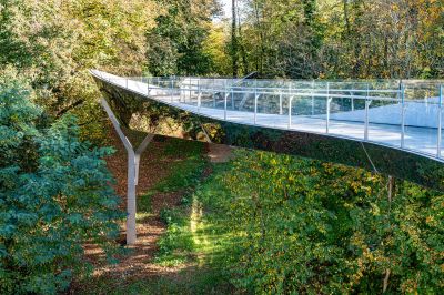 Tekst: La Passerelle des Arts, conçue par Marc Mimram Architecture Ingénierie et Fabeck Architectes, traverse une forêt précieuse et relie la principale avenue du quartier en plein essor de Kirchberg au Musée d’Art Moderne et au Musée Dräi Eechelen du Grand-Duché de Luxembourg. Bien au-delà de sa fonction de liaison, sa conception traduit un profond respect pour le paysage et l’écosystème qu’elle traverse. Son tracé sinueux en plan permet de préserver les arbres existants grâce à un système de courbes et de contre-courbes, tout en offrant aux piétons et aux cyclistes une expérience unique : une promenade douce et contemplative, à la hauteur de la canopée. Depuis le sol, le visiteur découvre le tablier qui apparait comme un objet extraordinaire, grâce à son matériau : l’acier inoxydable poli miroir. L’emploi de l’acier inoxydable poli miroir constitue une première mondiale pour une passerelle de cette envergure. Avec des propriétés mécaniques équivalentes à celles de l’acier au carbone, ce matériau ne nécessite aucun traitement anticorrosion (peinture, galvanisation ou métallisation), réduisant ainsi l’entretien pouvant perturber l’écosystème forestier. La conception structurelle et la fabrication ont nécessité le développement de techniques inédites de soudure, d’assemblage et de polissage. La structure, constituée de 180 tonnes d’acier inoxydable, se compose de tronçons fabriqués dans un atelier des Vosges, puis assemblés sur site par boulonnage intérieur invisible, préservant ainsi la continuité visuelle de l’inox poli miroir. Les plaques d’acier, longues de 10 m et larges jusqu’à 3,7 m, ont été achetées à l’état brut, découpées et pliées avant polissage post-assemblage, garantissant une finition miroir irréprochable. L’innovation la plus remarquable réside dans la relation dynamique entre l’ouvrage et son environnement. Selon les points de vue, selon les heures du jour, selon les saisons, par le jeu des reflets, l’ouvrage disparaît partiellement et entretien un dialogue permanent avec les arbres, qui varie comme le ciel en toutes saisons.