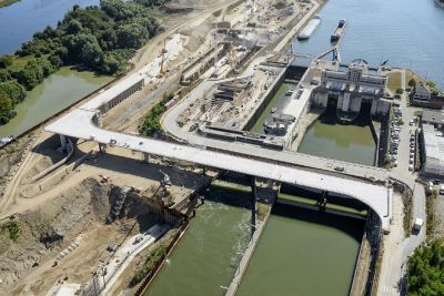Tekst: Dans le cadre de la réalisation de la plateforme multimodale Trilogiport à Hermalle-sous-Argenteau, un nouveau pont, d’une longueur totale d’environ 300 m, a été construit sur la Meuse. Sa plus grande travée présente une longueur de 88 m. La structure porteuse est constituée de deux poutres métalliques à hauteur variable (aciers S355 et S460), reliées par une dalle en béton connectée sur des pièces de pont métalliques (S355).
