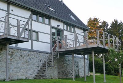 Tekst: La passerelle rejoint en un biais discret deux quartiers à Barvaux qui s’étend en contrebas. La passerelle, d’une longueur de 48,50 m (portée maximale : 30 m), a été conçue suivant un principe d’économie qui lui donne toute sa légèreté. Ainsi, le poids total de l’acier (S235 et S355), garde-corps compris, n’excède pas 21,5 t et l’ouvrage complet a pu être déposé sur ses appuis en un seul mouvement de grue.