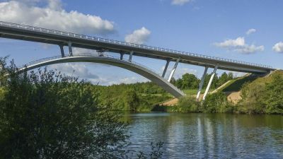 Tekst: L’ancien pont sur la Moselle a été remplacé par un nouvel ouvrage de 180 m de longueur de type bow-string. Cette technique a permis d’élargir le pont et d’intégrer des voies sécurisées dédiées aux modes de déplacement doux (piétons, vélos, cavaliers...). Mais surtout sa solidité a permis de rétablir le trafic des poids lourds et de l’ouvrir aux convois exceptionnels.