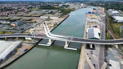 Tekst: Le pont Gull Wing à Lowestoft (Royaume-Uni) dans le sud-est de l'Angleterre, est l'aboutissement d'un vaste projet destiné à améliorer la circulation dans et autour du port. Le pont se compose de deux approches et d'un pont basculant roulant central, représentant au total 2200 tonnes d'acier. Le pont basculant est le plus grand du genre au monde. Victor Buyck Steel Construction (VBSC) a construit le pont entre 2021 et 2024. La première étape a consisté à acheminer les trois parties (totalisant 700 tonnes) de la rampe d'accès nord. Particularité de cette opération : la partie située au-dessus de la voie ferrée, y compris le tablier en béton et les finitions (1600 tonnes), a été mise en place pendant une interruption du trafic ferroviaire. Les autres parties ont été soulevées et mises en place à l'aide d'une grue sur chenilles lourde installée sur le ponton de transport. VBSC a transporté et monté le pont d'accès sud en 4 parties (totalisant 818 tonnes), qui ont été assemblées à l'aide de joints boulonnés. Pour le pont basculant à rouleaux, un arrêt intermédiaire à Westdorpe était nécessaire lors du transport par voie maritime. Les bras ('J-beams') y ont été montés et le pont a été achevé dans la mesure du possible, y compris les accessoires pour le mécanisme de mouvement. Les poutres en J ont constitué un défi majeur en raison de l'importance des travaux de soudure, des tolérances très strictes, des exigences particulières liées aux processus de déchargement et de l'accessibilité limitée. Afin d'éliminer les tensions dues à la soudure, les poutres en J ont été recuites dans un four spécialisé. Le pont, qui pesait plus de 1 000 tonnes avec son lest de transport, a été mis en place à l'aide de vérins de levage depuis le ponton après avoir été transporté par voie maritime. Le contrepoids en béton dans les poutres en J a été inséré sur place. Grâce au mécanisme à rouleaux, le chenal peut être utilisé sur toute sa largeur après l'ouverture du pont. En position ouverte, le sommet des poutres en J s'élève à 61 m au-dessus du niveau de l'eau. Le pont a été officiellement inauguré le 7 septembre 2024. Le pont Gull Wing est un joyau architectural et une prouesse technique. Le nom et la forme du pont Gull Wing font référence aux mouettes omniprésentes à Lowestoft.