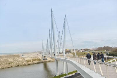 Tekst: D'apparence modeste et ingénieusement intégré dans un espace restreint. Le 'Suikerbrug' (pont sucre) à Veurne (Furnes), avec ses rampes peu raides et faciles d'accès, semble presque flotter au-dessus de la route et du canal. Vous pouvez y faire du vélo ou vous promener en toute sécurité parmi les cimes des arbres, depuis le nouveau quartier résidentiel situé sur l'ancien site de la sucrerie jusqu'à la vieille ville, en passant par l'eau. Avec une nouvelle perspective à chaque virage, la traversée devient une expérience spatiale. Le pont est constitué d'une poutre en acier élancée et d'un tablier en béton, et est soutenu par des colonnes extrêmement minces. La conception regorge de solutions innovantes, telles que les appuis pendulaires cachés dans les semelles, les virages en porte-à-faux et les poutres de fondation en porte-à-faux dues aux fondations de l'écluse. Tous les matériaux sont conformes à la norme NBN EN 10025 pour les produits plats et longs, dans un type d'acier S355 et S460. Les épaisseurs nominales des éléments en acier varient de 6 mm (plaque de recouvrement du socle) à 80 mm maximum (colonnes) et 120 mm (socle colonne en forme de V). La structure en acier a reçu une finition exceptionnellement durable. Après un sablage intensif, elle a été traitée avec une métallisation Zn-Alu pulvérisée à la flamme de 100-120 microns. Ensuite, un système de conservation à 6 couches a été appliqué.