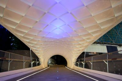 Tekst: Au coeur de Shenzhen, au Sud de la Chine, le quartier de Futian est en plein redéveloppement. Un complexe résidentiel et commercial haut de gamme comprend plusieurs ouvrages d'art. La passerelle ‘Time Tunel’ (35 x 3,5 m) est couverte et ouverte sur l'extérieur, pour créer une connexion agréable entre les bâtiments, dans l'axe de la place centrale. Conçue comme une surface continue, la structure de la passerelle est une coque en acier raidie par une trame oblique de raidisseurs placés sur sa face interne.