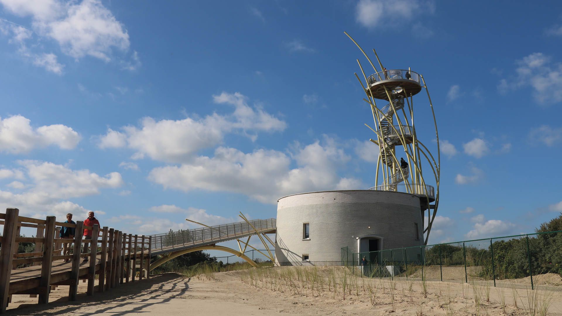 Dans le nouveau projet, une chemin sur pilotis s’élève pour se transformer en pont, limitant ainsi les dommages causés au sol naturel. La nature, le sable et le vent peuvent s’en donner à cœur joie. Il s’agissait de créer une nouvelle structure au-dessus de la base existante. Un surprenant faisceau de tubes serpente autour de l’escalier en colimaçon. Cet éventail de tubes galvanisés et laqués fait référence aux oyats, les si typiques joncs des dunes. Ces brins d’acier soutiennent l’escalier en colimaçon, une plateforme de repos et une plateforme panoramique située à 20 m de haut.