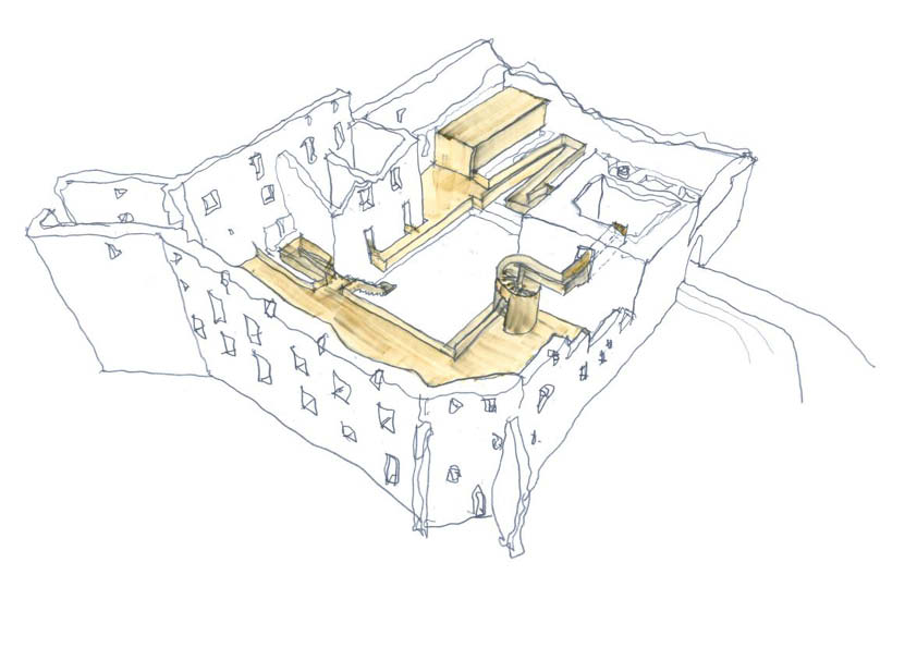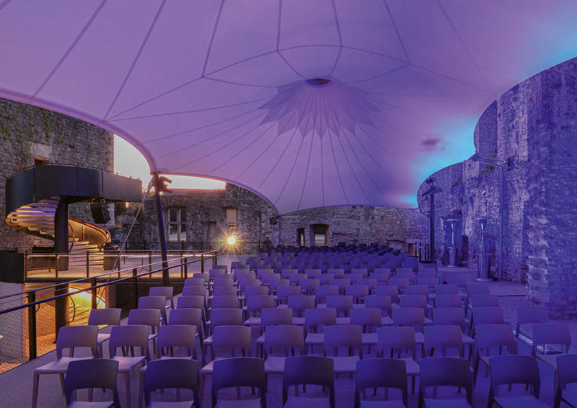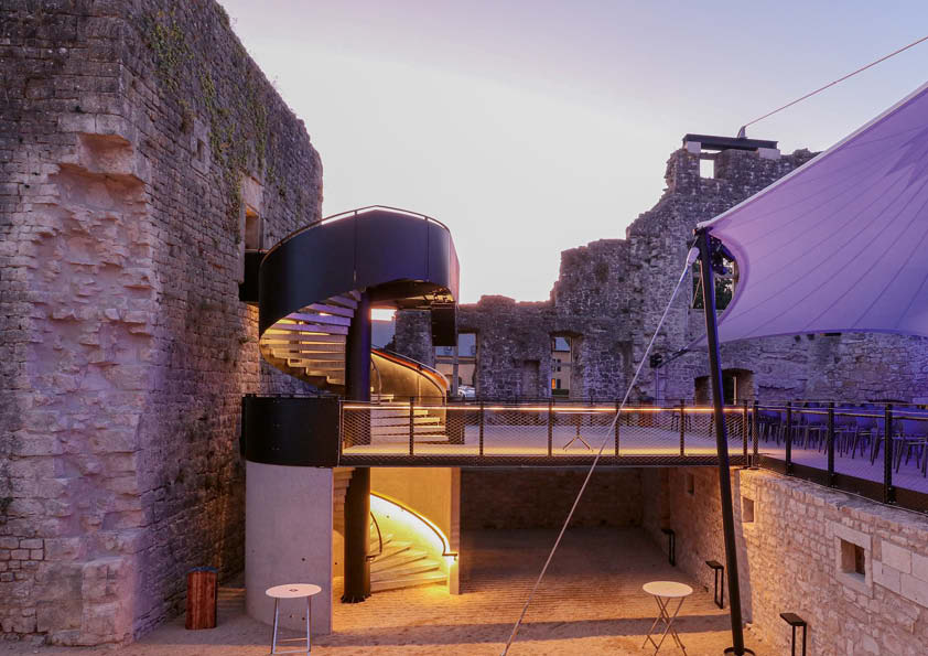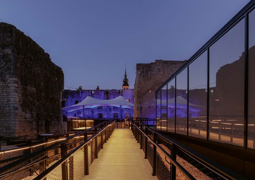 Dans la Vallée des Sept Châteaux, à Koerich, visiteurs, artistes et audience profitent désormais du mariage réussi entre conservation du patrimoine et aménagement de nouvelles fonctions. Passerelles, plateformes, rampes et escaliers y créent un parcours inédit. L’intervention pourra être enlevée un jour en laissant un minimum de traces. L’acier a donc été choisi pour son côté filigrane et léger et recyclable. Il a été employé sous diverses formes : en structure tendue, boulonnée, soudée, en maille métallique, en filet inox, en câbles inox et éléments thermolaqués, … Etant donné l’exposition aux intempéries, la quasi-totalité des composants métalliques de l’ouvrage sont réalisés en aciers inoxydable de haute qualité. Deux finitions sont utilisées : un noir pour les composants en contact direct avec le bâti existant et une finition de l’inox par microbillage pour les éléments en acier propre à la toile tendue. Une couverture architecturale en PTFE couvre la scène.