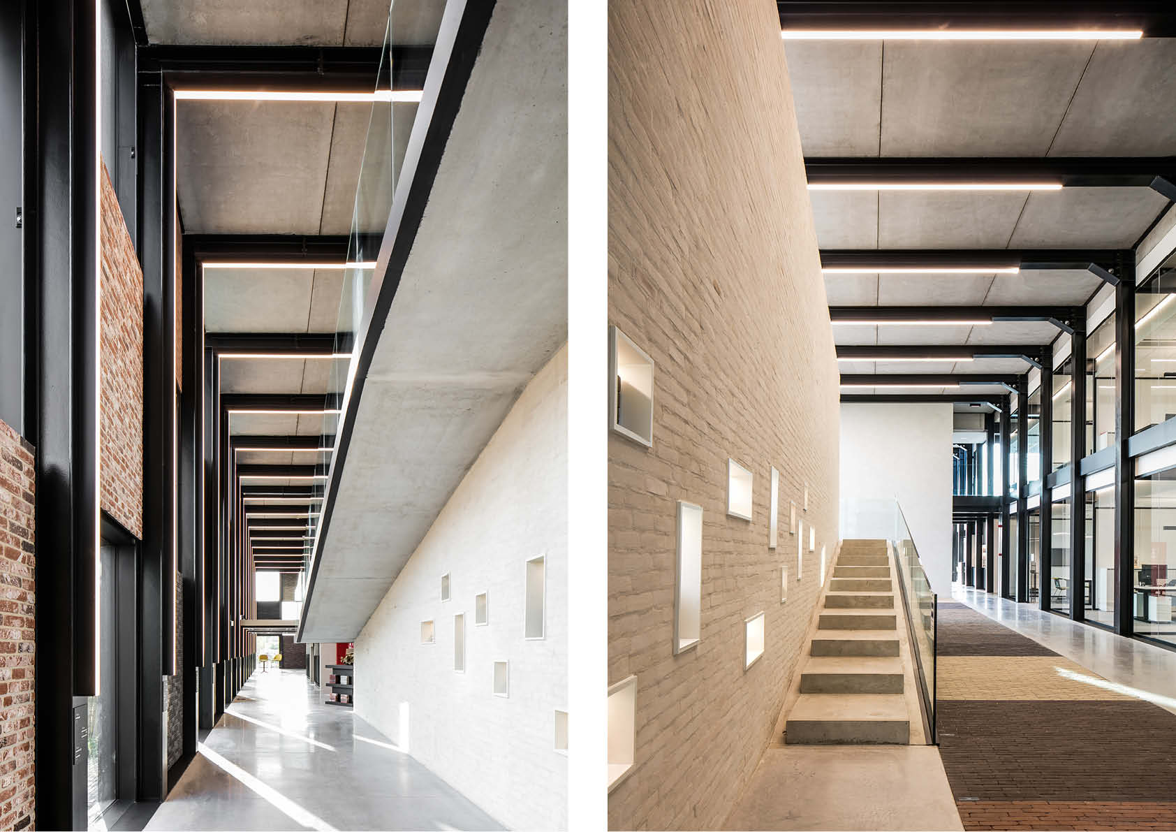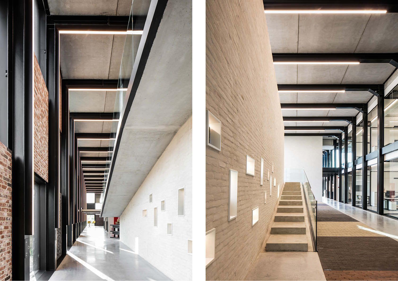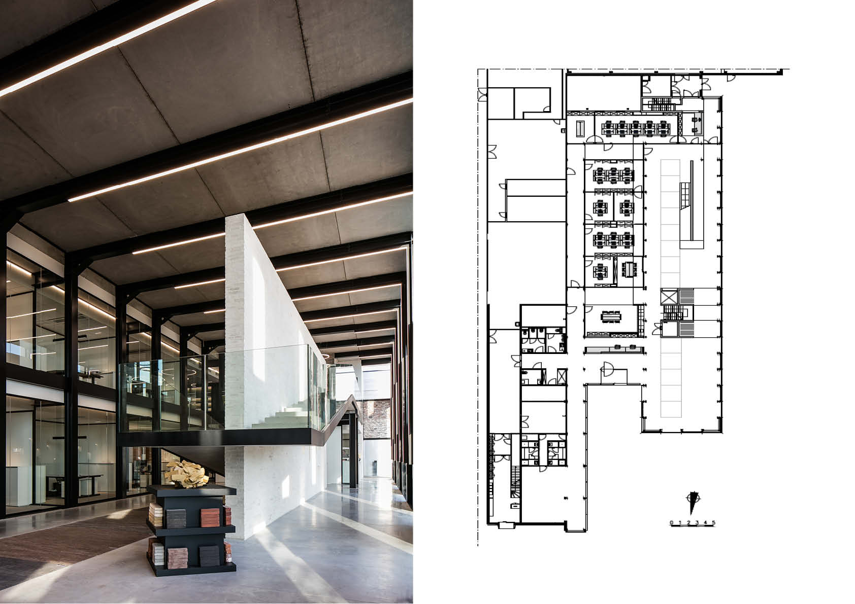 Un escalier flottant mène aux bureaux. Le troisième étage comprend une impressionnante bibliothèque pour les réunions, entièrement finie en briques et en pavés en terre cuite.