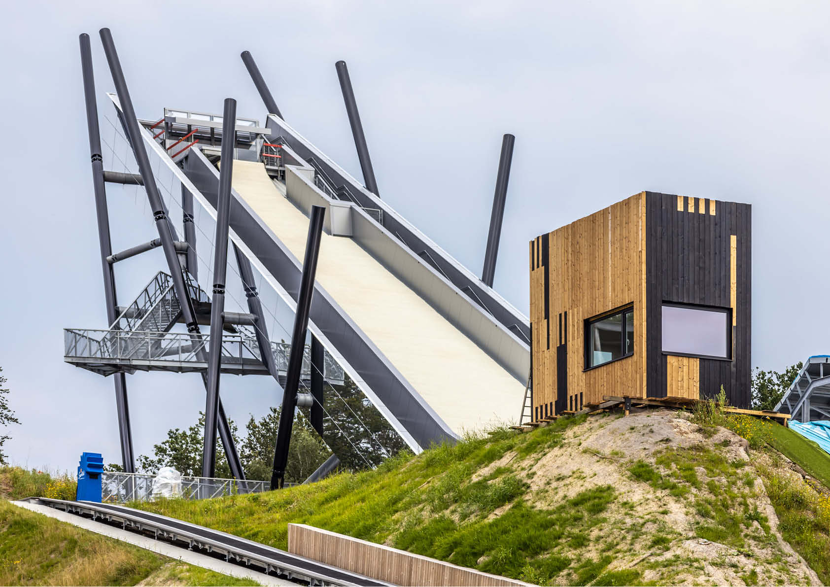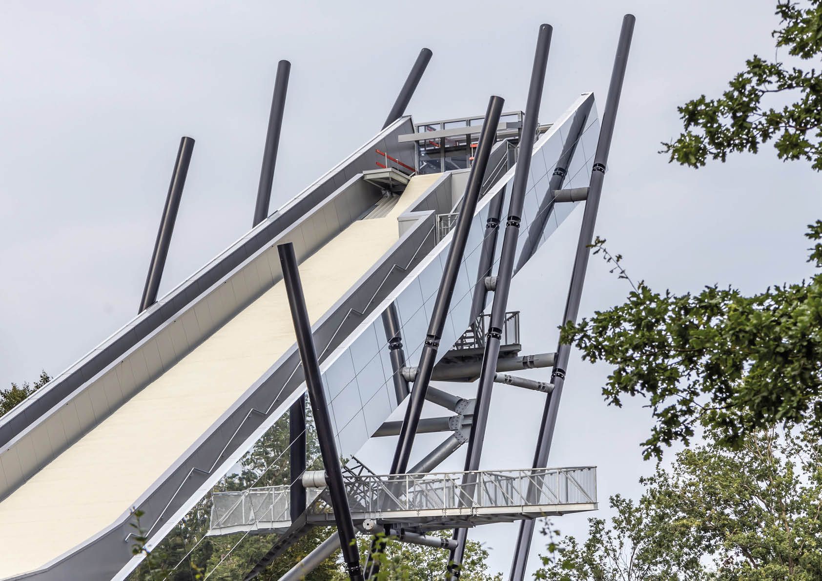 Pour augmenter la rigidité et permettre de grands porte-à-faux, ce tracé en éclair est construit à partir de poutres soudées constituées de tubes scellés avec du métal déployé pour faire office de garde-corps. Grâce à un revêtement de 890 m² de cassettes en aluminium réfléchissant, la dry slope s'intègre parfaitement dans l'environnement boisé.