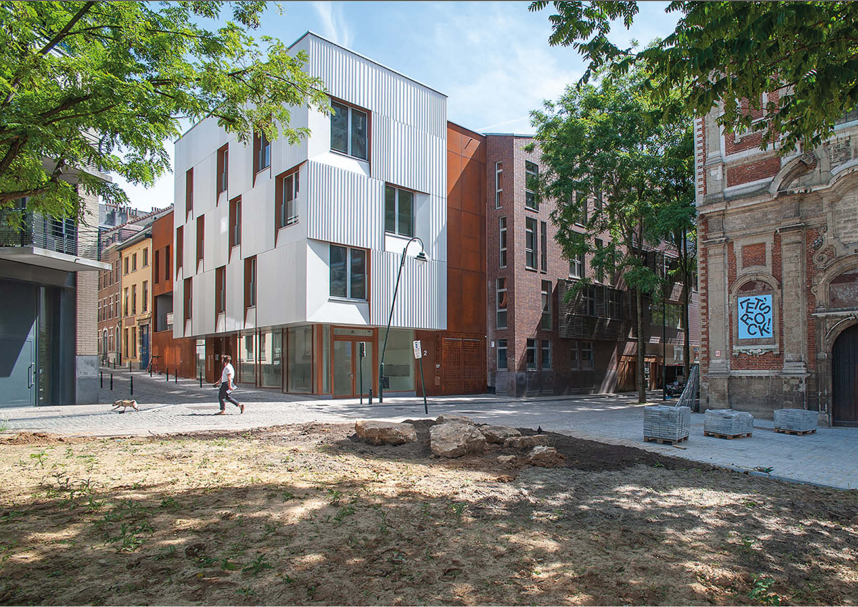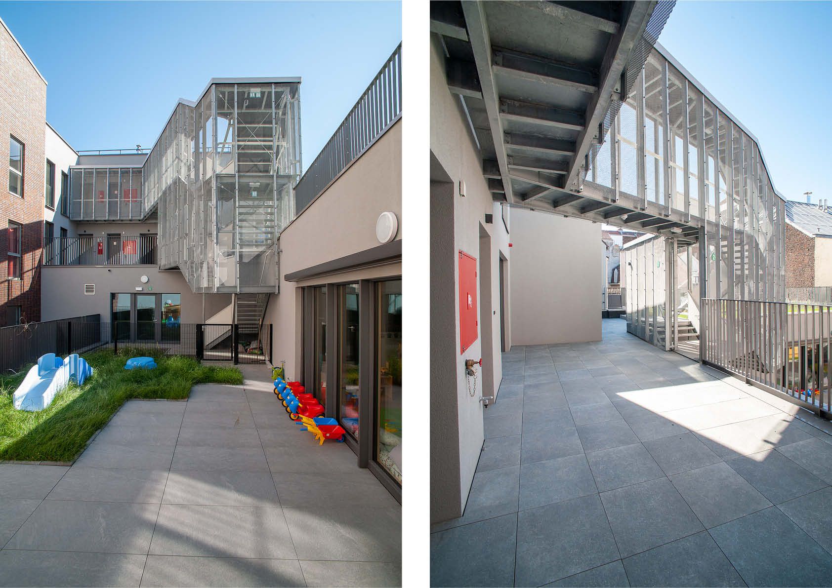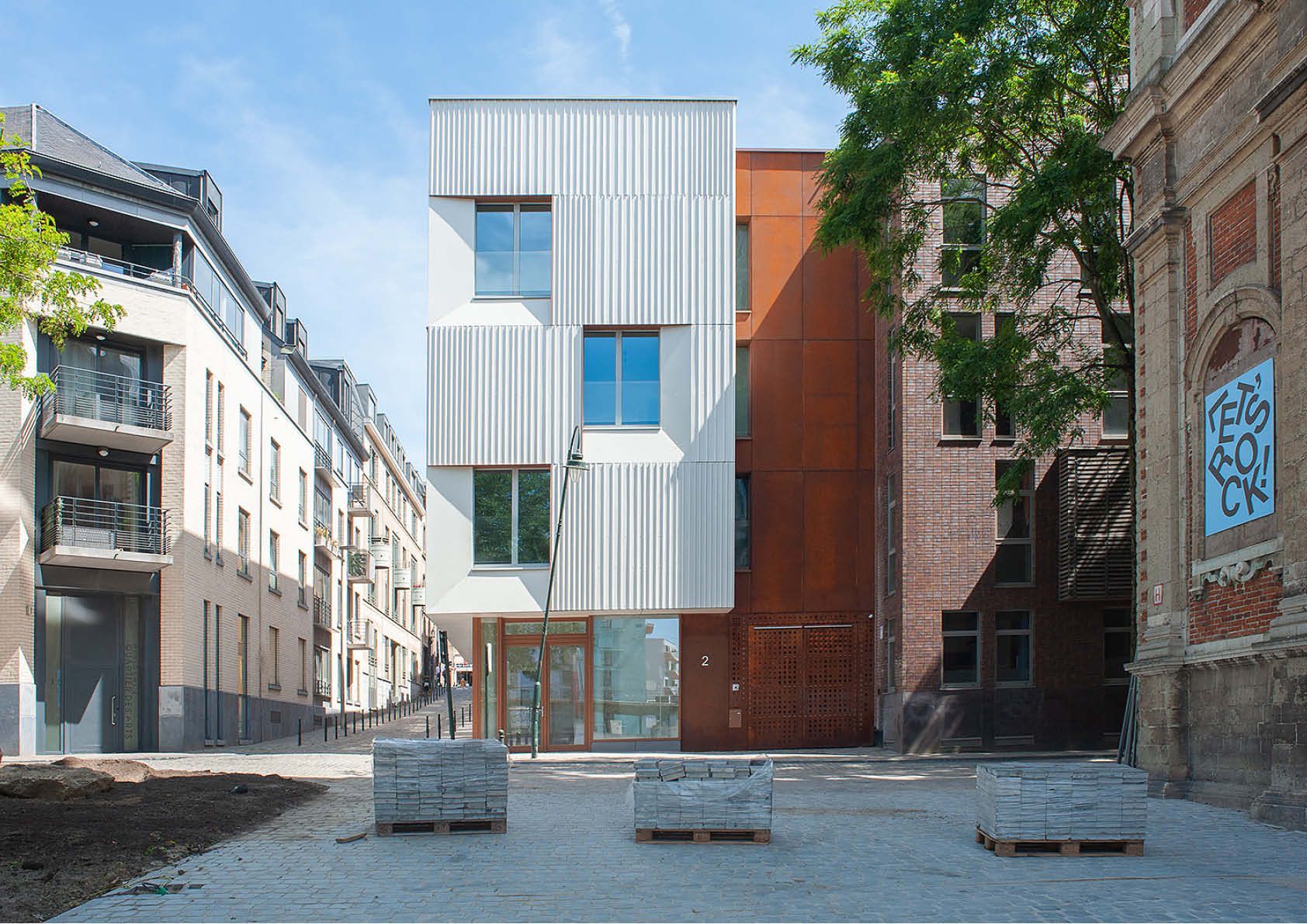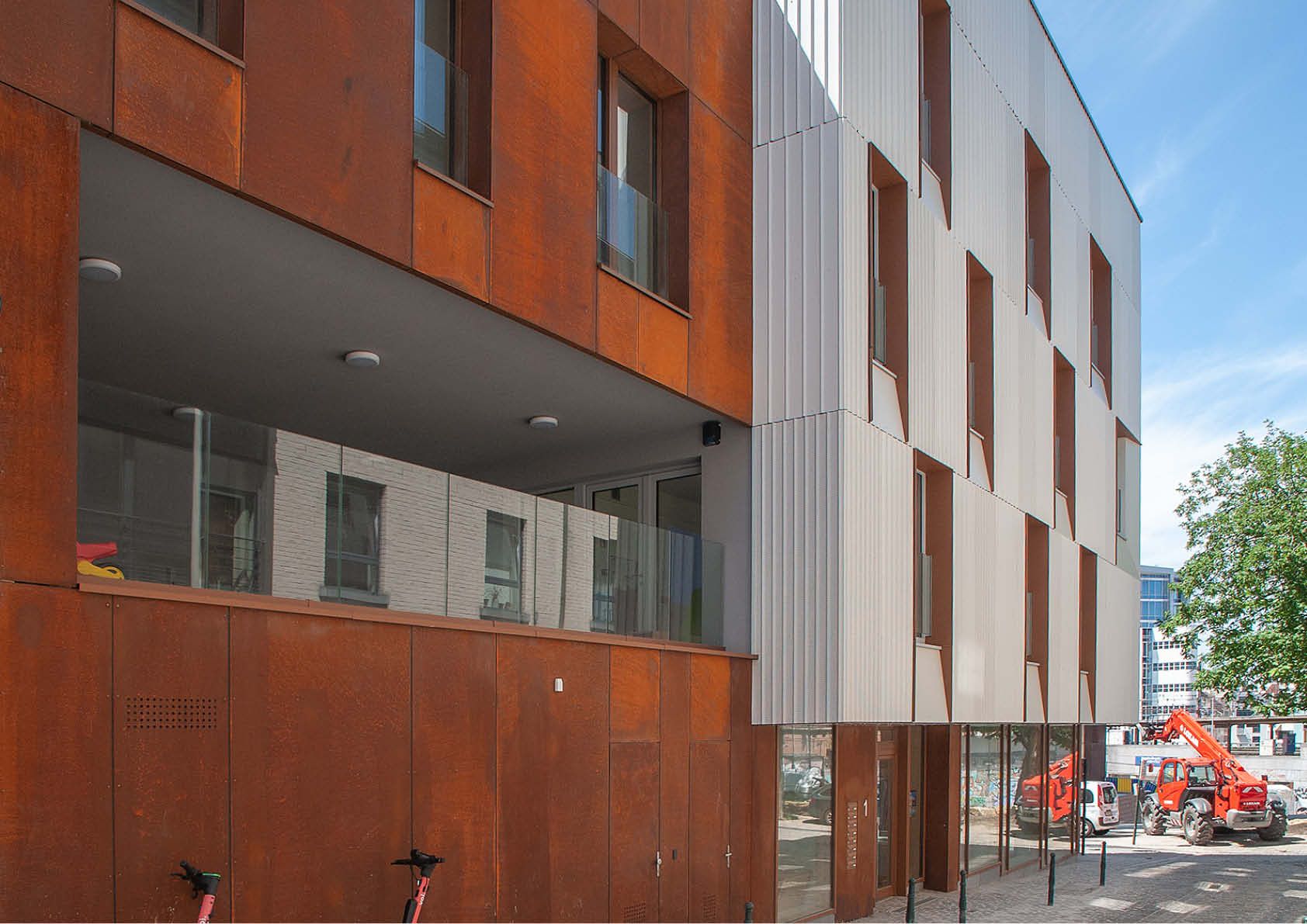 Pour ce bâtiment comprenant une crèche, une salle commune, 5 logements à finalité sociale et un parking, l’utilisation de plusieurs types d’acier a été privilégié pour des raisons esthétiques et permet une intégration douce au bâti environnant. Ainsi, le bardage en acier corten, d’une surface totale de 286 m2, rappelle la couleur de la terre cuite traditionnelle présente dans les bâtiments du quartier.