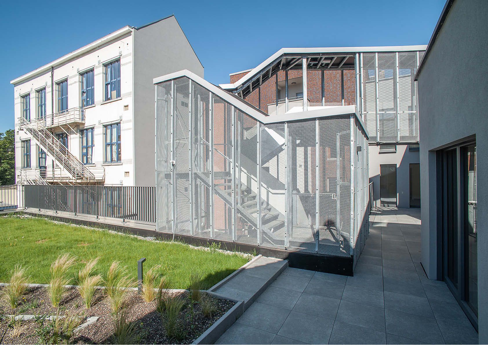 Un bardage en tôles d’acier nervurées et perforées a quant à lui été utilisé pour le volume supérieur marquant l’angle du projet et de la rue, avec la création d’un rythme alterné de perforations et d’ondulations de la tôle, donnant un aspect de légèreté aléatoire à la façade. L’escalier extérieur menant aux entrées des différents logements est constitué d’une structure en acier galvanisé de près de 3 tonnes et est enrobé d’une maille métallique.