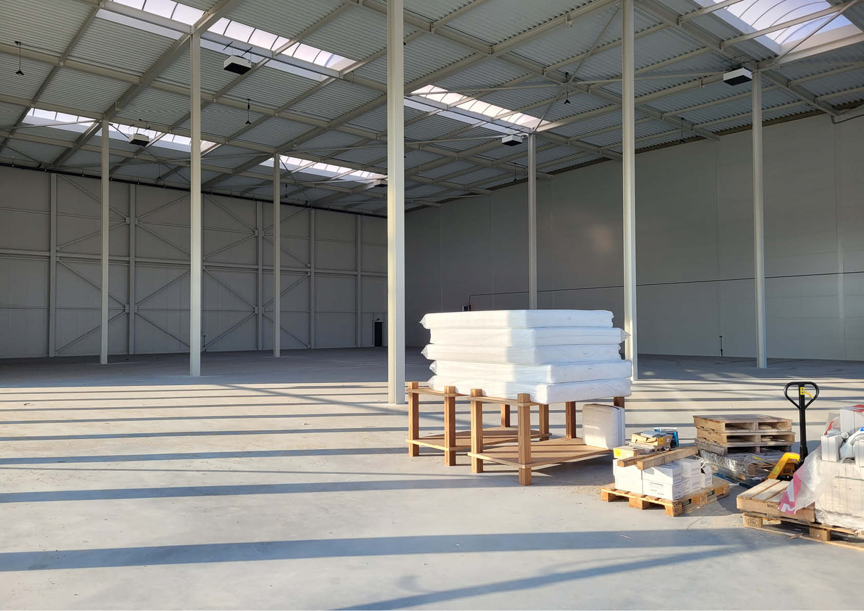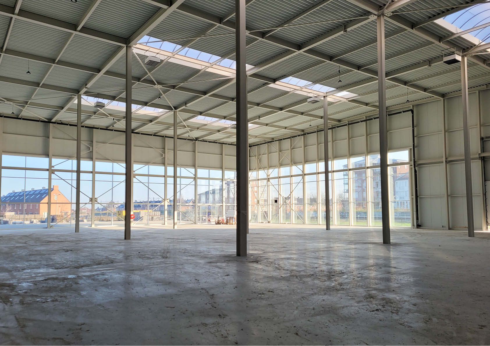 Les applications d’acier dans le cadre du projet concernent l’ensemble des structures de support du bâtiment, y compris les colonnes, les poutres de toiture, les galets escamotables au niveau des murs coupe-feu, le revêtement de façade constitué de panneaux sandwich isolés et les tôles profilées de toiture.