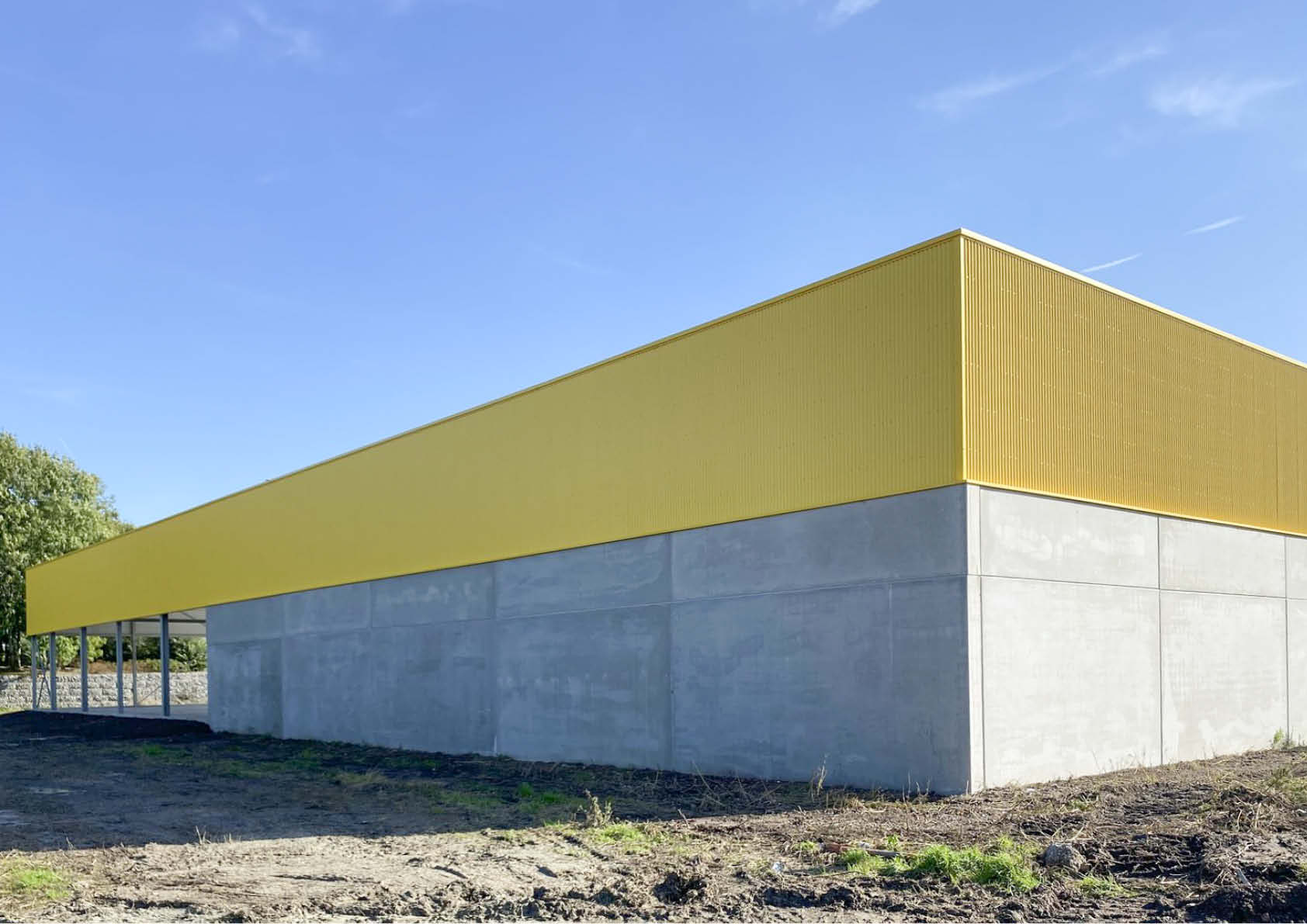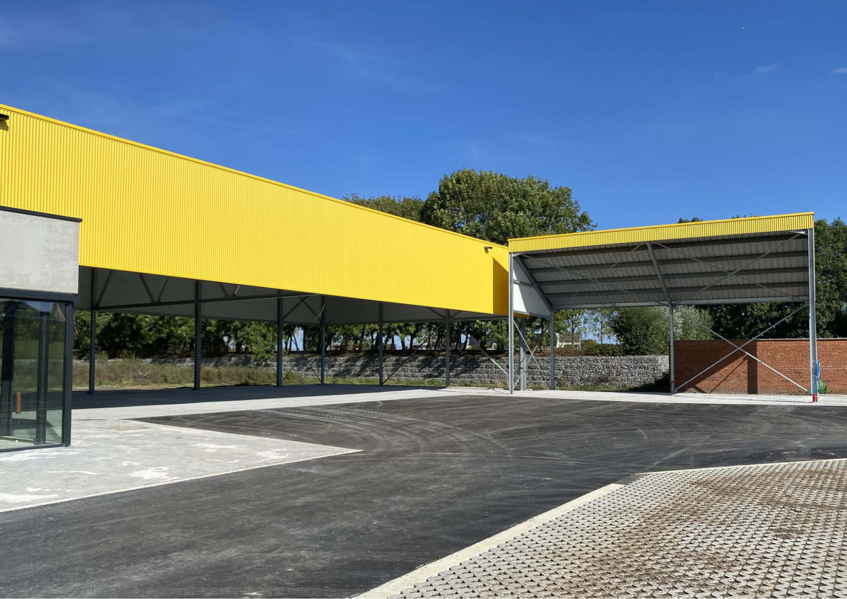 Le bâtiment se scinde en deux, avec le hangar d'un côté et l'auvent de l'autre.  Au fond de l'abri, une "plinthe" en panneaux de béton forme un bel ensemble avec les blocs de béton pour le stockage du sel de voirie. Le volume supérieur du bâtiment s'étend comme un auvent au-dessus du parking où seront garées toutes les voitures de l'entreprise. Les tôles d'acier profilées procurent au bâtiment un aspect frais et contemporain. Les cadres de fenêtres et les portails en aluminium noir complètent le logo noir et jaune de Kapelle-op-den-Bos.