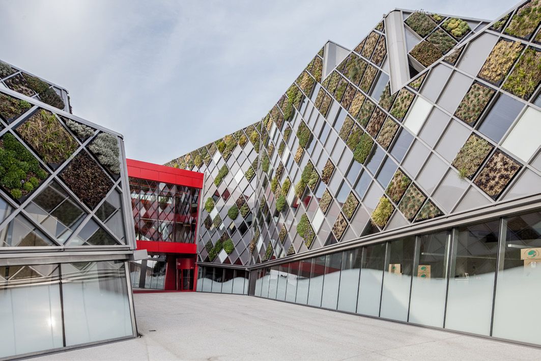 Le nouvel Hôtel de Ville (12.500 m2) attire l’attention par ses façades : végétalisées, inclinées et non rectilignes, avec une pose de profilés mur-rideau à 45°, elles sont complétées par une passerelle rouge vif, sur deux niveaux, qui relie les deux ailes. Intérieurement, il se caractérise par l’utilisation de planchers mixtes bois-béton, portés par une charpente métallique en grande partie visible.