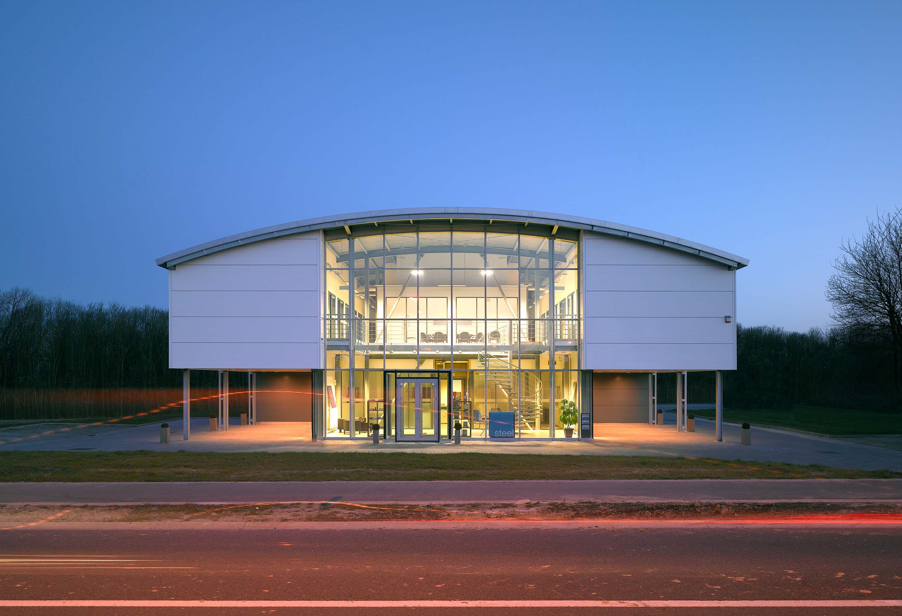 Le nouveau siège social de STEEL s.a., société spécialisée dans la fabrication et l’installation d’armoire à comptage d’énergie est situé à Ottignies-Louvain-la-Neuve. Le bâtiment se compose d’une surface de bureaux et d’un atelier de montage et de stockage. Le bâtiment de 2 niveaux a été pensé suivant une typologie d’architecture semi-industrielle. La structure principale est entièrement préfabriquée et mixte métal/béton. Les poutres de planchers, les poutres cintrées de la toiture et les colonnes sont métalliques. Pour éviter les ponts thermiques, des éléments de connexion à coupure thermique ont été placés. L’emploi d’éléments en béton tels que des hourdis pour les planchers et des voiles béton pour la cage d’escalier de secours ont permis de créer un élément de contreventement de l’ensemble de la structure. Les façades sont réalisées en panneaux sandwichs revêtus extérieurement de bardage métallique de 2 tons différents, blanc nacré pour l’étage et gris graphite pour le rez-de-chaussée. La toiture courbe réalisée en bacs d’aluminium à joints debout a été choisie pour son intégration douce dans le terrain et son cachet industriel.
