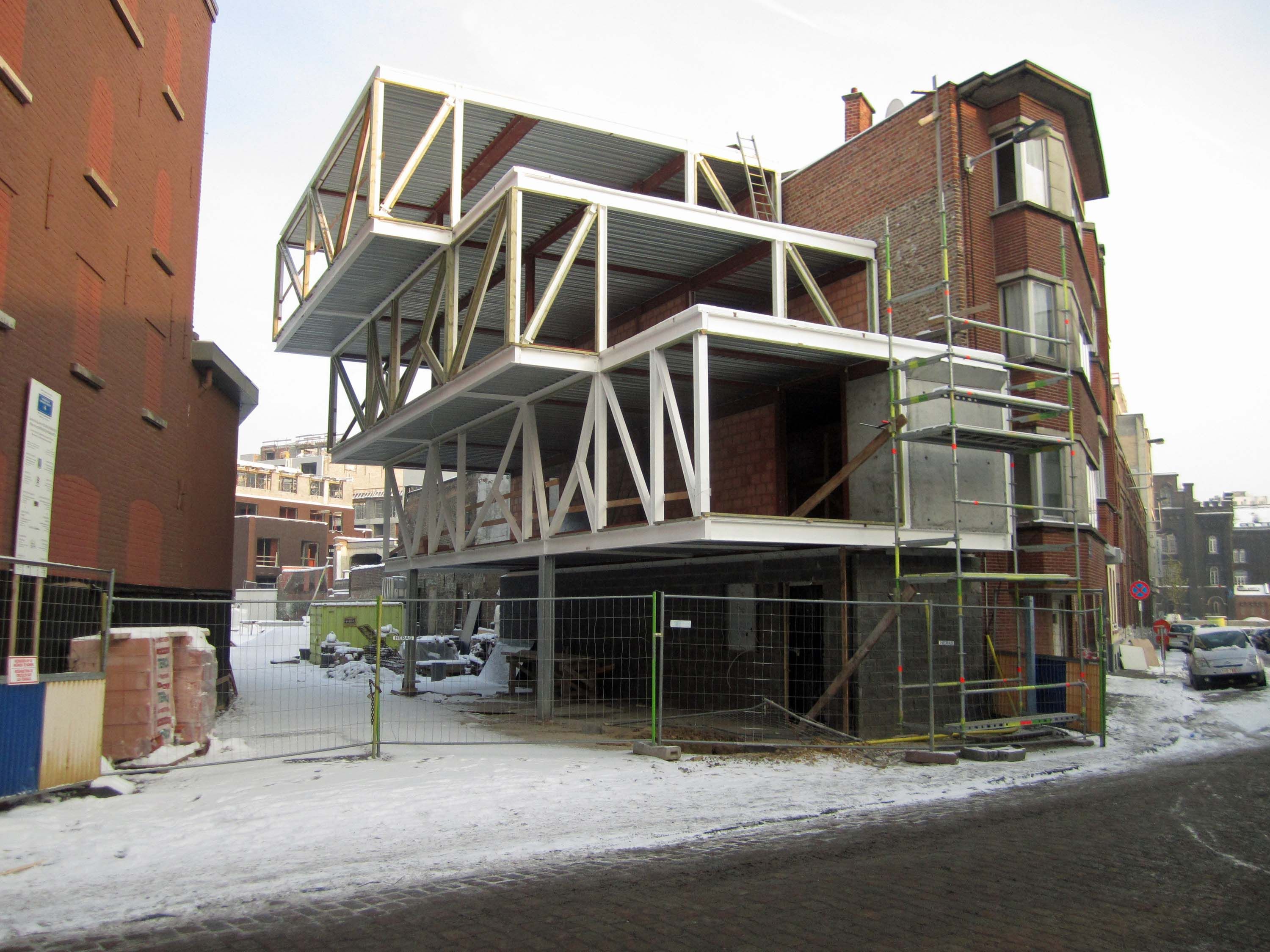 In het hart van Sint-Jans-Molenbeek werd een oude industriële site omgetoverd tot een open ruimte met een park en een nieuw appartementencomplex. De basisstructuur van het nieuwe pand, dat plaats biedt aan drie sociale appartementen, bestaat uit een staalskelet met staalbetonvloeren. Het skelet (28 ton staal) is opgevat als een stapelbouw met HEB140- en IEPE270-profielen (staalklasse S 235 JO) en enkele HEB200-liggers. Het werd bekleed met brandwerende verf. Het gebouw zelf heeft een getrapte constructie met twee zijdelingse uitkragingen van telkens 1,5 meter, die worden opgevangen door summiere spantwerkingen. De aanwezigheid van deze uitkragingen en de vraag naar een structuur die de architectuur zo min mogelijk zou hinderen, maakte de keuze voor staal evident.